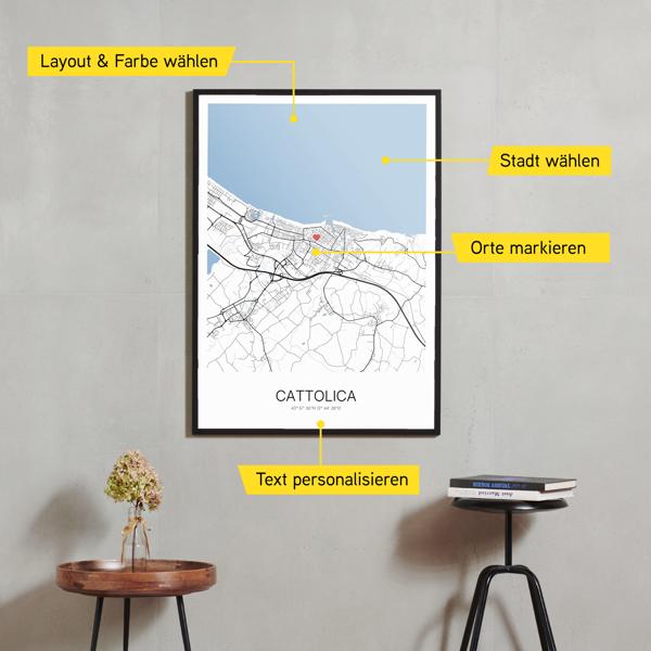 Wähle Farben und Layouts, die perfekt zu dir passen. Ob als klassische Karte in schwarz-weiß oder in modernen Farben. Bei Cartida kannst du ein Design in deinen Lieblingsfarben wählen. Erstelle eine Variante von Cattolica, die perfekt zu dir und deiner Wohnung passt.