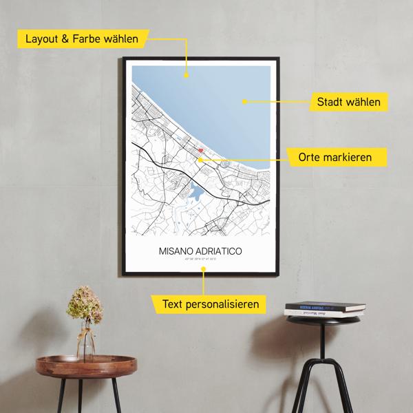 Wähle Farben und Layouts, die perfekt zu dir passen. Ob als klassische Karte in schwarz-weiß oder in modernen Farben. Bei Cartida kannst du ein Design in deinen Lieblingsfarben wählen. Erstelle eine Variante von Misano Adriatico, die perfekt zu dir und deiner Wohnung passt.