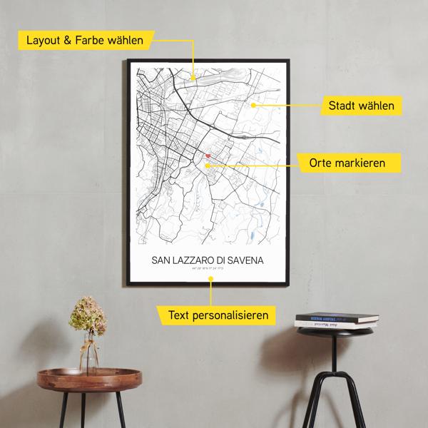 Wähle Farben und Layouts, die perfekt zu dir passen. Ob als klassische Karte in schwarz-weiß oder in modernen Farben. Bei Cartida kannst du ein Design in deinen Lieblingsfarben wählen. Erstelle eine Variante von San Lazzaro di Savena, die perfekt zu dir und deiner Wohnung passt.