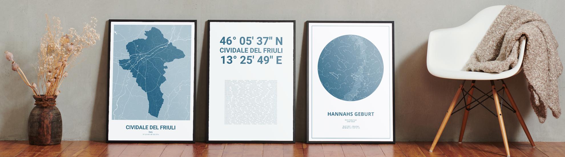 Wähle Farben und Layouts, die perfekt zu dir passen. Ob als klassische Karte in schwarz-weiß oder in modernen Farben. Bei Cartida kannst du ein Design in deinen Lieblingsfarben wählen. Erstelle eine Variante von Cividale del Friuli, die perfekt zu dir und deiner Wohnung passt.