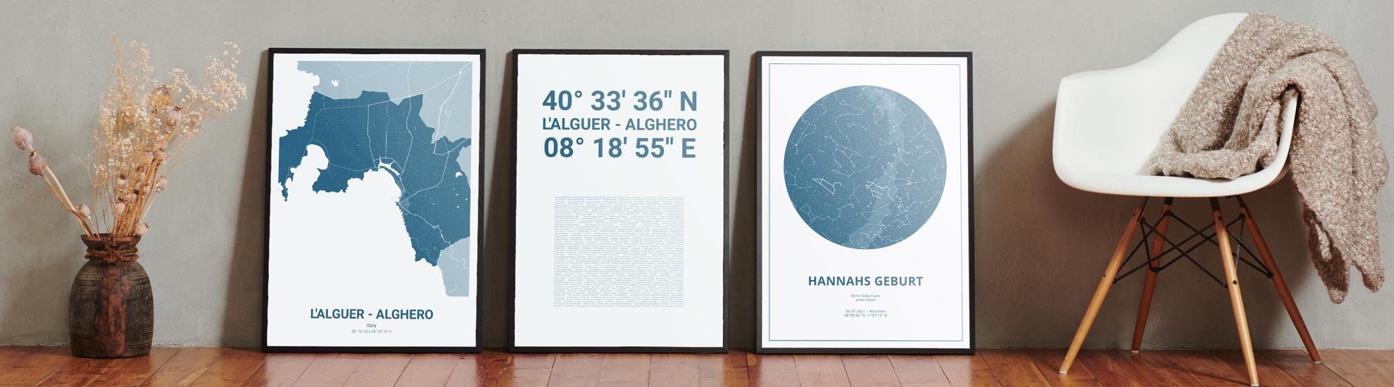 Zahlen, die die Welt bedeuten. Erstelle jetzt dein persönliches Koordinaten-Kunstwerk von deiner Lieblingsstadt. Entscheide selbst, ob Stadtteile, Straßen oder ganz eigene Texte abgedruckt werden. Perfekt als Geschenk zum Einzug oder für die eigenen vier Wände.