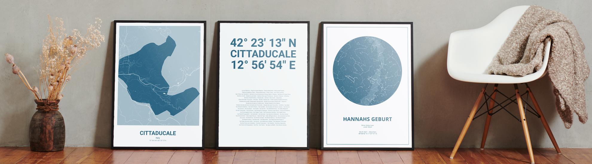 Wir bei Cartida haben alle deine Lieblingsorte. Erstelle im Cartida-Editor dein persönlichen Stadtplan für dich und dein Zuhause. Einfach den Ort eingeben und nach deinen Wünschen personalisieren: Markiere die wichtigsten Orte, wähle deine Lieblingsfarben und füge die Koordinaten und einen persönlichen Text hinzu.