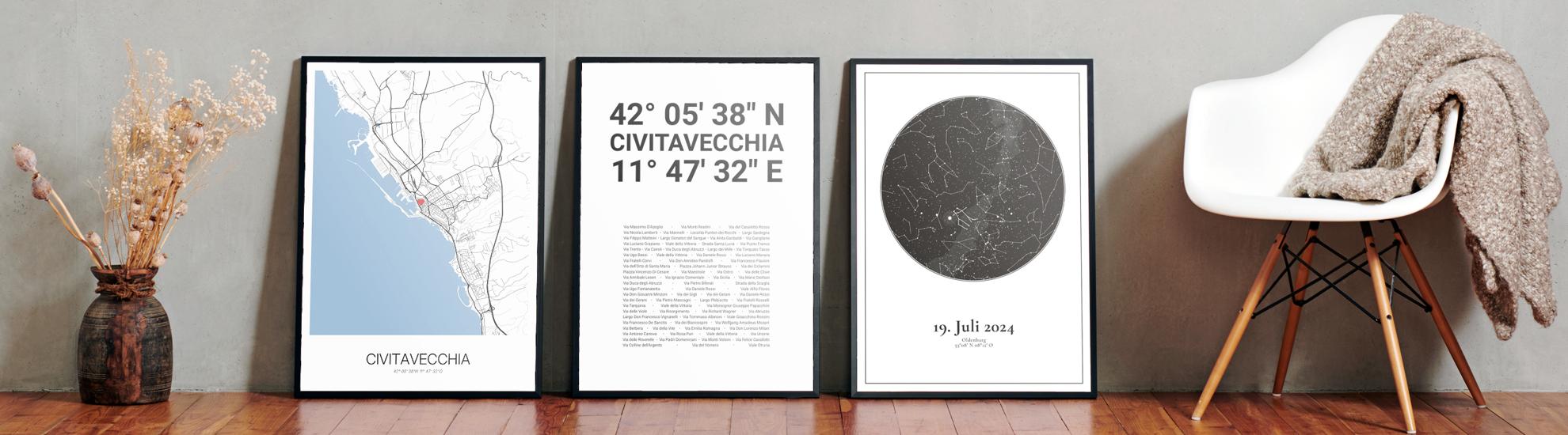 Wähle Farben und Layouts, die perfekt zu dir passen. Ob als klassische Karte in schwarz-weiß oder in modernen Farben. Bei Cartida kannst du ein Design in deinen Lieblingsfarben wählen. Erstelle eine Variante von Civitavecchia, die perfekt zu dir und deiner Wohnung passt.