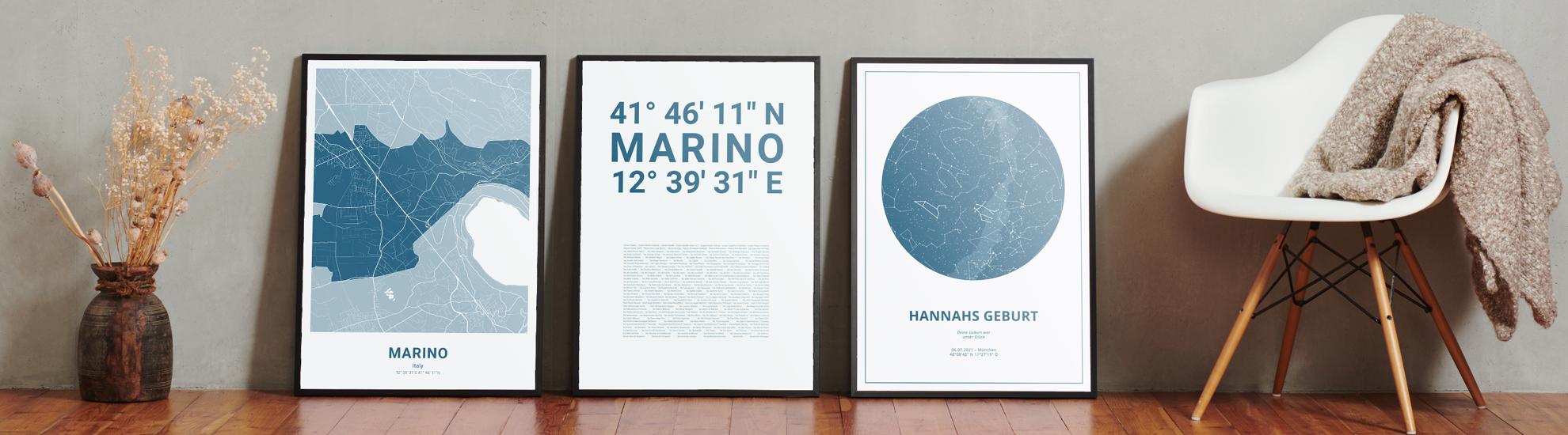Zahlen, die die Welt bedeuten. Erstelle jetzt dein persönliches Koordinaten-Kunstwerk von deiner Lieblingsstadt. Entscheide selbst, ob Stadtteile, Straßen oder ganz eigene Texte abgedruckt werden. Perfekt als Geschenk zum Einzug oder für die eigenen vier Wände.