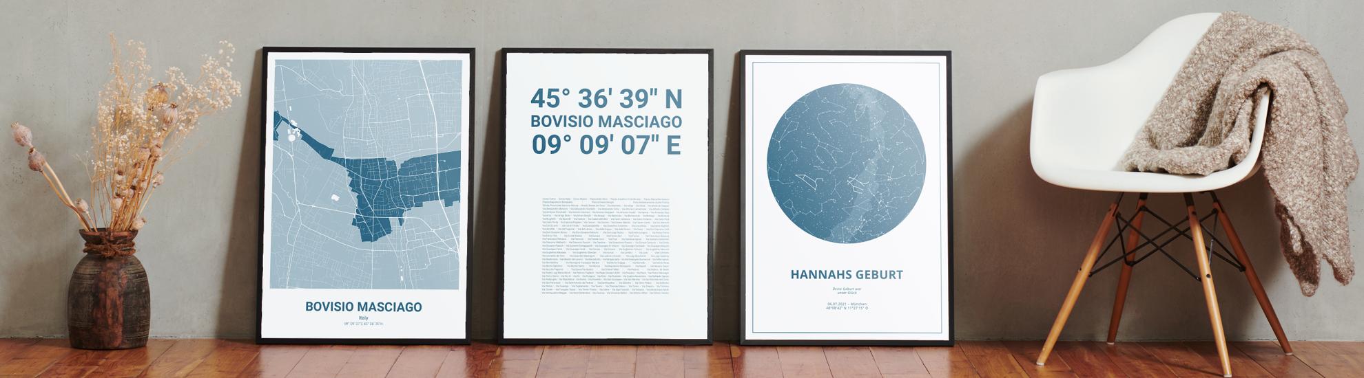 Zahlen, die die Welt bedeuten. Erstelle jetzt dein persönliches Koordinaten-Kunstwerk von deiner Lieblingsstadt. Entscheide selbst, ob Stadtteile, Straßen oder ganz eigene Texte abgedruckt werden. Perfekt als Geschenk zum Einzug oder für die eigenen vier Wände.