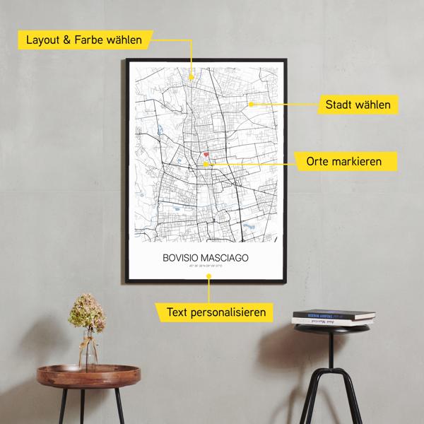 Wähle Farben und Layouts, die perfekt zu dir passen. Ob als klassische Karte in schwarz-weiß oder in modernen Farben. Bei Cartida kannst du ein Design in deinen Lieblingsfarben wählen. Erstelle eine Variante von Bovisio Masciago, die perfekt zu dir und deiner Wohnung passt.