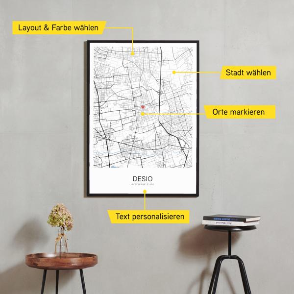Wähle Farben und Layouts, die perfekt zu dir passen. Ob als klassische Karte in schwarz-weiß oder in modernen Farben. Bei Cartida kannst du ein Design in deinen Lieblingsfarben wählen. Erstelle eine Variante von Desio, die perfekt zu dir und deiner Wohnung passt.