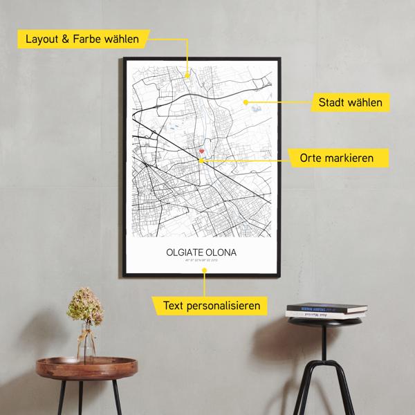 Wähle Farben und Layouts, die perfekt zu dir passen. Ob als klassische Karte in schwarz-weiß oder in modernen Farben. Bei Cartida kannst du ein Design in deinen Lieblingsfarben wählen. Erstelle eine Variante von Olgiate Olona, die perfekt zu dir und deiner Wohnung passt.
