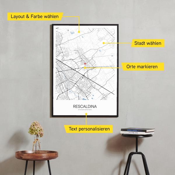 Wähle Farben und Layouts, die perfekt zu dir passen. Ob als klassische Karte in schwarz-weiß oder in modernen Farben. Bei Cartida kannst du ein Design in deinen Lieblingsfarben wählen. Erstelle eine Variante von Rescaldina, die perfekt zu dir und deiner Wohnung passt.