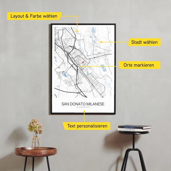 Wähle Farben und Layouts, die perfekt zu dir passen. Ob als klassische Karte in schwarz-weiß oder in modernen Farben. Bei Cartida kannst du ein Design in deinen Lieblingsfarben wählen. Erstelle eine Variante von San Donato Milanese, die perfekt zu dir und deiner Wohnung passt.