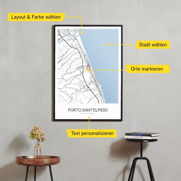 Wähle Farben und Layouts, die perfekt zu dir passen. Ob als klassische Karte in schwarz-weiß oder in modernen Farben. Bei Cartida kannst du ein Design in deinen Lieblingsfarben wählen. Erstelle eine Variante von Porto Sant'Elpidio, die perfekt zu dir und deiner Wohnung passt.