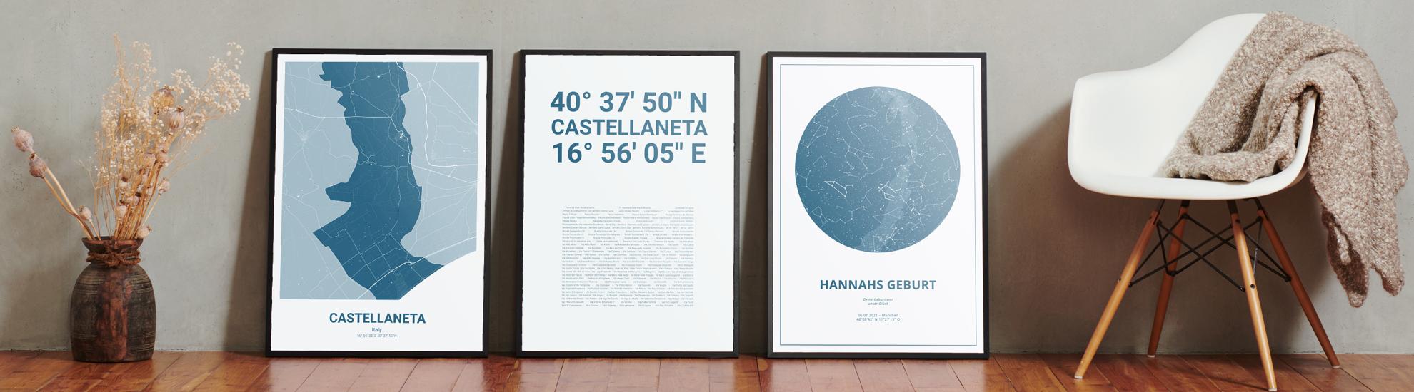 Zahlen, die die Welt bedeuten. Erstelle jetzt dein persönliches Koordinaten-Kunstwerk von deiner Lieblingsstadt. Entscheide selbst, ob Stadtteile, Straßen oder ganz eigene Texte abgedruckt werden. Perfekt als Geschenk zum Einzug oder für die eigenen vier Wände.