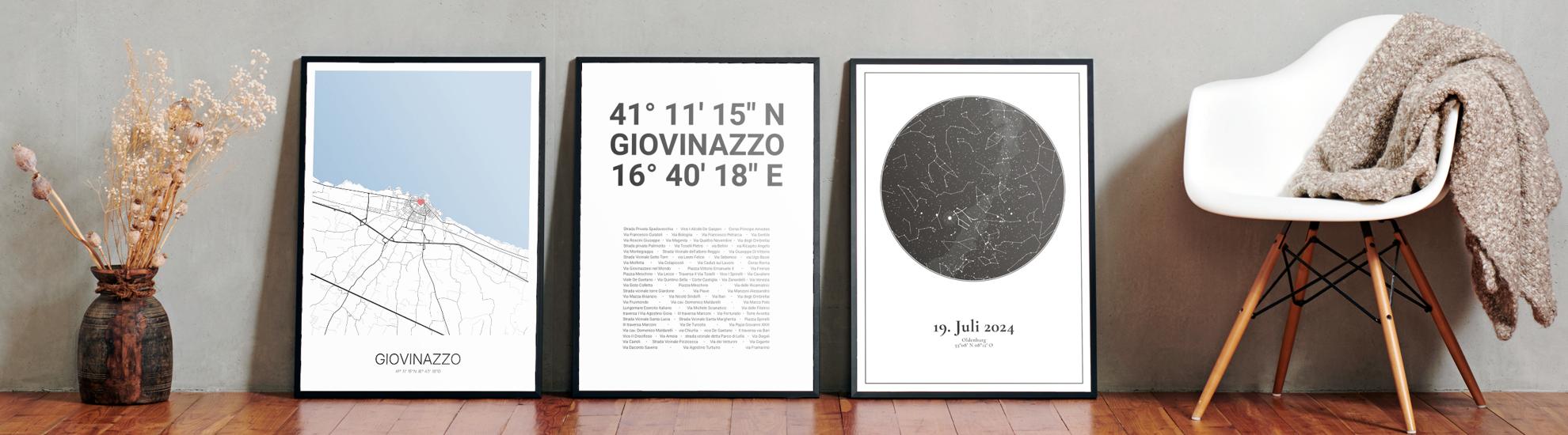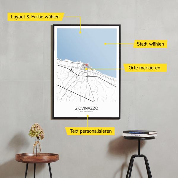 Wähle Farben und Layouts, die perfekt zu dir passen. Ob als klassische Karte in schwarz-weiß oder in modernen Farben. Bei Cartida kannst du ein Design in deinen Lieblingsfarben wählen. Erstelle eine Variante von Giovinazzo, die perfekt zu dir und deiner Wohnung passt.