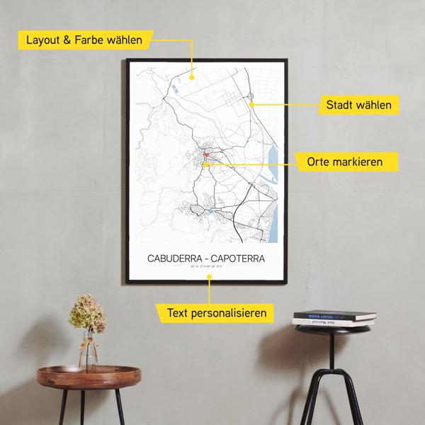 Wähle Farben und Layouts, die perfekt zu dir passen. Ob als klassische Karte in schwarz-weiß oder in modernen Farben. Bei Cartida kannst du ein Design in deinen Lieblingsfarben wählen. Erstelle eine Variante von Cabuderra - Capoterra, die perfekt zu dir und deiner Wohnung passt.