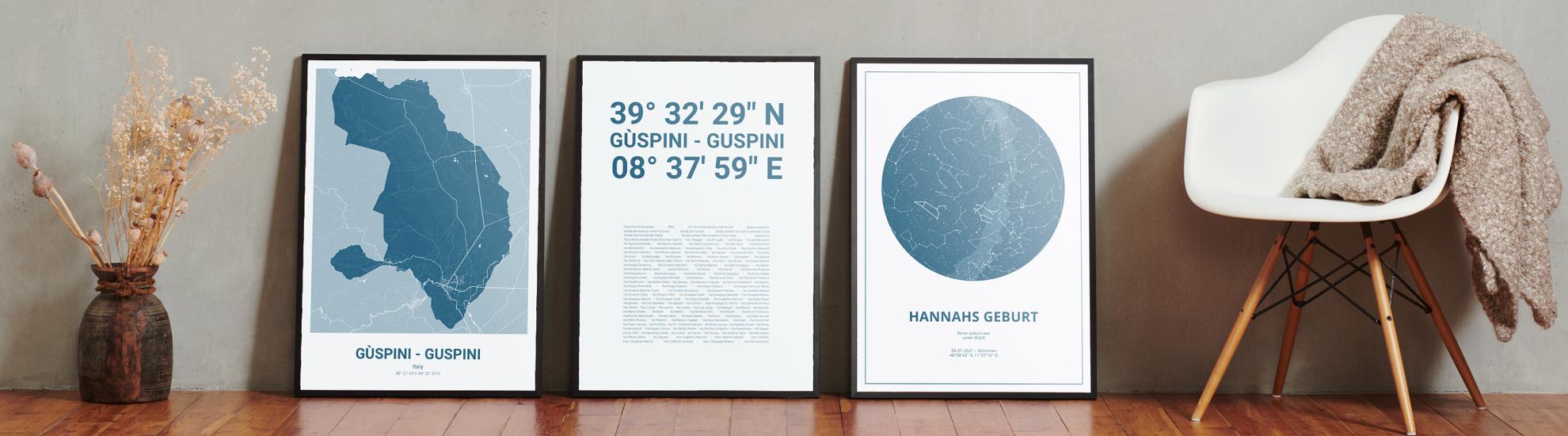Zahlen, die die Welt bedeuten. Erstelle jetzt dein persönliches Koordinaten-Kunstwerk von deiner Lieblingsstadt. Entscheide selbst, ob Stadtteile, Straßen oder ganz eigene Texte abgedruckt werden. Perfekt als Geschenk zum Einzug oder für die eigenen vier Wände.