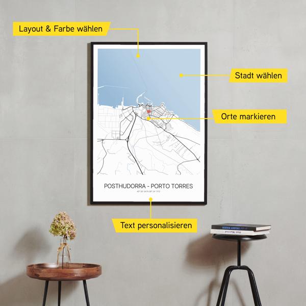 Wähle Farben und Layouts, die perfekt zu dir passen. Ob als klassische Karte in schwarz-weiß oder in modernen Farben. Bei Cartida kannst du ein Design in deinen Lieblingsfarben wählen. Erstelle eine Variante von Posthudorra - Porto Torres, die perfekt zu dir und deiner Wohnung passt.