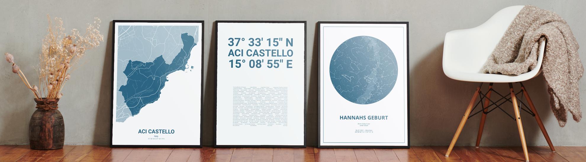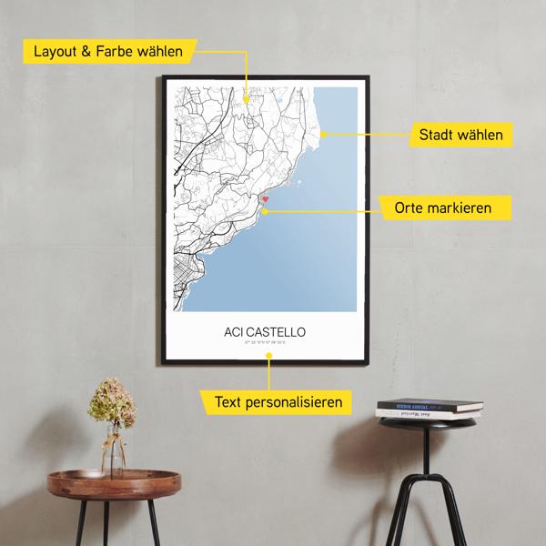 Wähle Farben und Layouts, die perfekt zu dir passen. Ob als klassische Karte in schwarz-weiß oder in modernen Farben. Bei Cartida kannst du ein Design in deinen Lieblingsfarben wählen. Erstelle eine Variante von Aci Castello, die perfekt zu dir und deiner Wohnung passt.