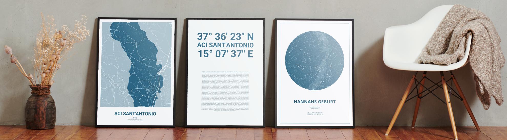 Zahlen, die die Welt bedeuten. Erstelle jetzt dein persönliches Koordinaten-Kunstwerk von deiner Lieblingsstadt. Entscheide selbst, ob Stadtteile, Straßen oder ganz eigene Texte abgedruckt werden. Perfekt als Geschenk zum Einzug oder für die eigenen vier Wände.