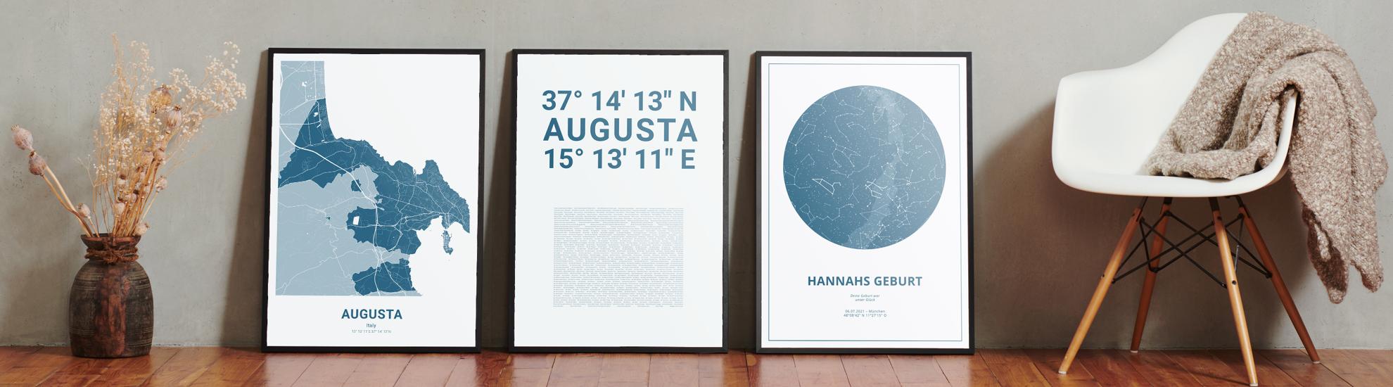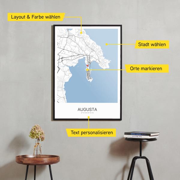 Wähle Farben und Layouts, die perfekt zu dir passen. Ob als klassische Karte in schwarz-weiß oder in modernen Farben. Bei Cartida kannst du ein Design in deinen Lieblingsfarben wählen. Erstelle eine Variante von Augusta, die perfekt zu dir und deiner Wohnung passt.