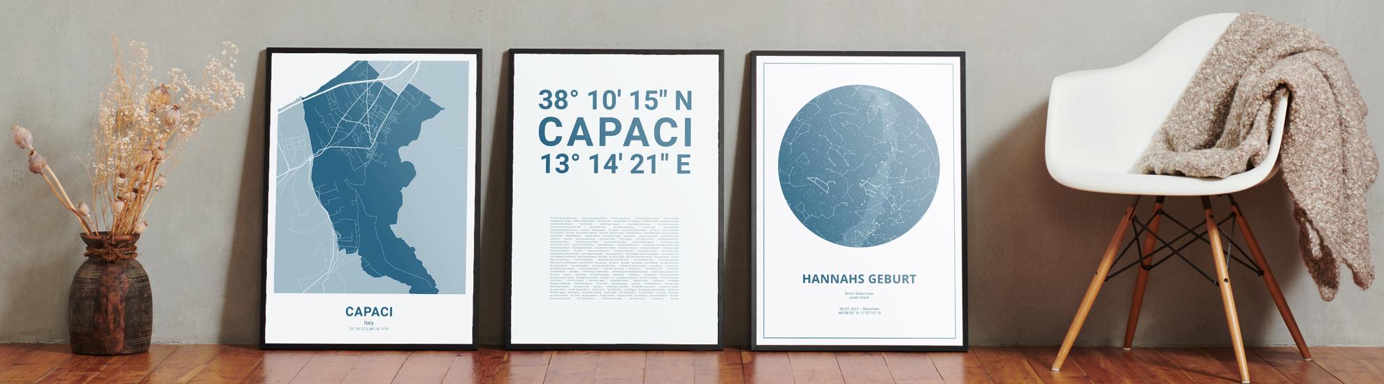 Wir bei Cartida haben alle deine Lieblingsorte. Erstelle im Cartida-Editor dein persönlichen Stadtplan für dich und dein Zuhause. Einfach den Ort eingeben und nach deinen Wünschen personalisieren: Markiere die wichtigsten Orte, wähle deine Lieblingsfarben und füge die Koordinaten und einen persönlichen Text hinzu.