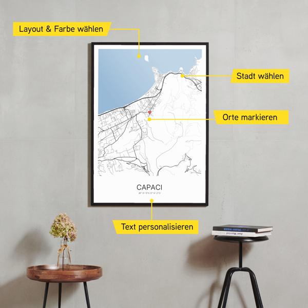 Wähle Farben und Layouts, die perfekt zu dir passen. Ob als klassische Karte in schwarz-weiß oder in modernen Farben. Bei Cartida kannst du ein Design in deinen Lieblingsfarben wählen. Erstelle eine Variante von Capaci, die perfekt zu dir und deiner Wohnung passt.