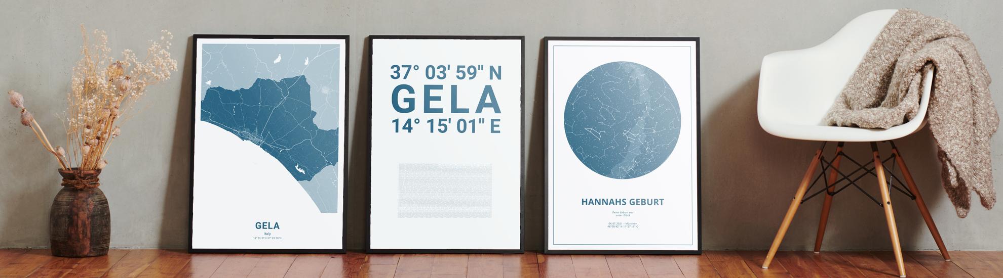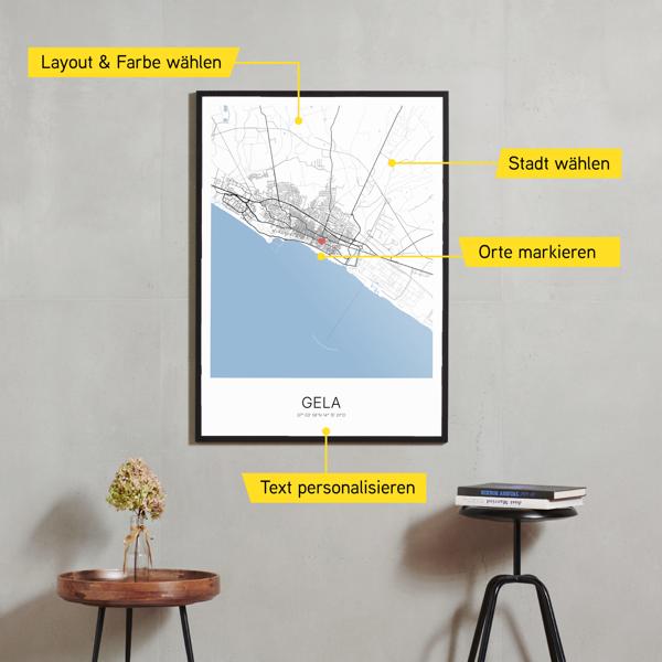 Wähle Farben und Layouts, die perfekt zu dir passen. Ob als klassische Karte in schwarz-weiß oder in modernen Farben. Bei Cartida kannst du ein Design in deinen Lieblingsfarben wählen. Erstelle eine Variante von Gela, die perfekt zu dir und deiner Wohnung passt.