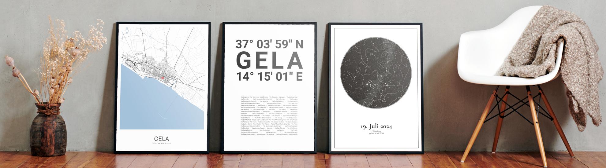 Bilder, die Geschichten erzählen über Reisen, Liebe und Erinnerungen. Wir bei Cartida haben deine Stadtkarte von Gela in Sicilia, Italien. Dargestellt als Schwarzplan mit Gebäuden oder als Minimal City Map mit filigranen Straßennetz.