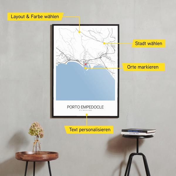 Wähle Farben und Layouts, die perfekt zu dir passen. Ob als klassische Karte in schwarz-weiß oder in modernen Farben. Bei Cartida kannst du ein Design in deinen Lieblingsfarben wählen. Erstelle eine Variante von Porto Empedocle, die perfekt zu dir und deiner Wohnung passt.