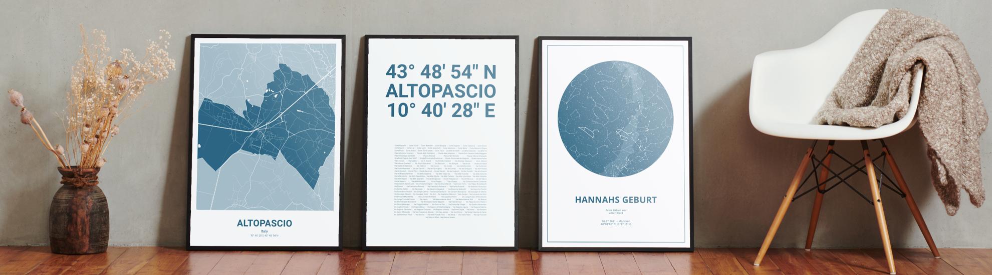 Zahlen, die die Welt bedeuten. Erstelle jetzt dein persönliches Koordinaten-Kunstwerk von deiner Lieblingsstadt. Entscheide selbst, ob Stadtteile, Straßen oder ganz eigene Texte abgedruckt werden. Perfekt als Geschenk zum Einzug oder für die eigenen vier Wände.