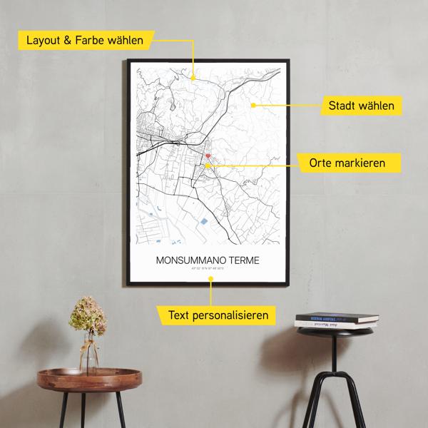 Wähle Farben und Layouts, die perfekt zu dir passen. Ob als klassische Karte in schwarz-weiß oder in modernen Farben. Bei Cartida kannst du ein Design in deinen Lieblingsfarben wählen. Erstelle eine Variante von Monsummano Terme, die perfekt zu dir und deiner Wohnung passt.