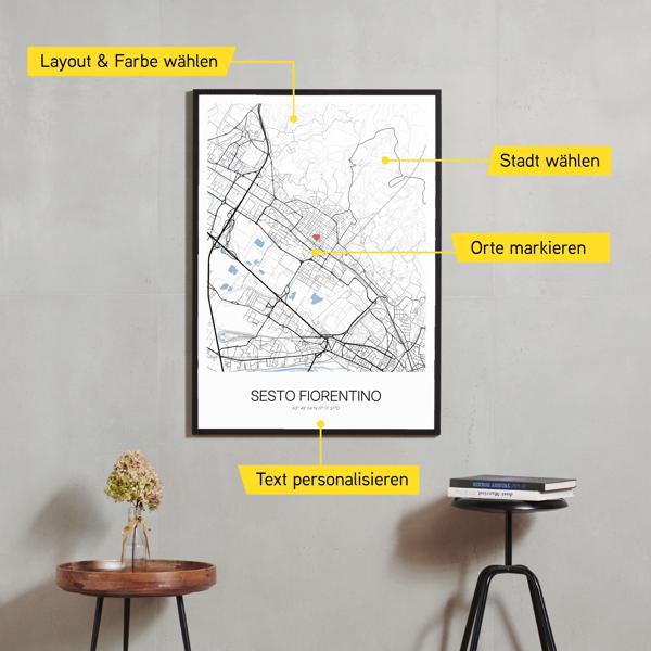 Wähle Farben und Layouts, die perfekt zu dir passen. Ob als klassische Karte in schwarz-weiß oder in modernen Farben. Bei Cartida kannst du ein Design in deinen Lieblingsfarben wählen. Erstelle eine Variante von Sesto Fiorentino, die perfekt zu dir und deiner Wohnung passt.