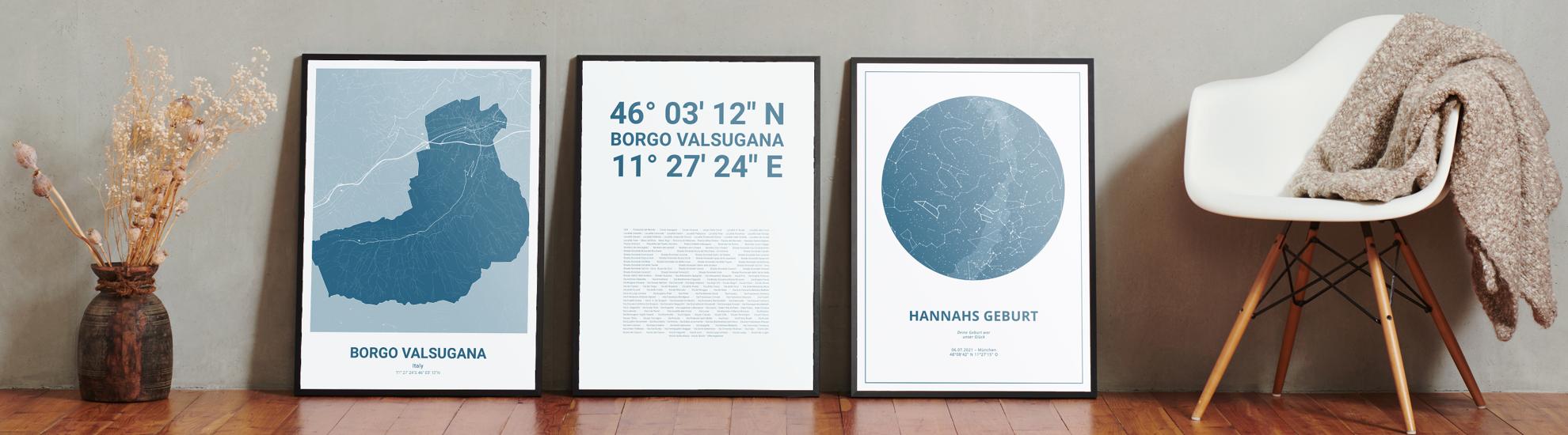 Zahlen, die die Welt bedeuten. Erstelle jetzt dein persönliches Koordinaten-Kunstwerk von deiner Lieblingsstadt. Entscheide selbst, ob Stadtteile, Straßen oder ganz eigene Texte abgedruckt werden. Perfekt als Geschenk zum Einzug oder für die eigenen vier Wände.
