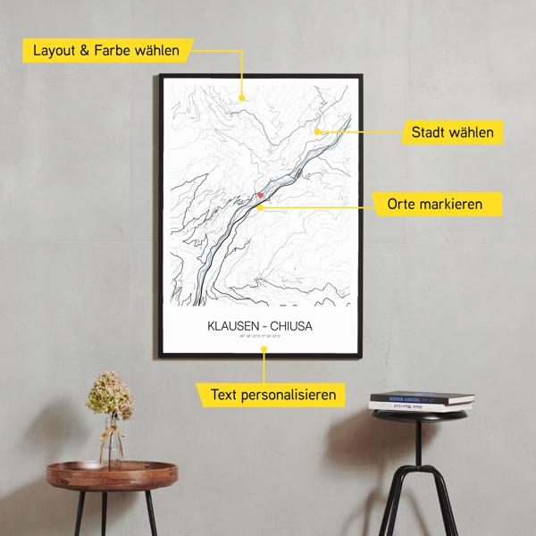 Wähle Farben und Layouts, die perfekt zu dir passen. Ob als klassische Karte in schwarz-weiß oder in modernen Farben. Bei Cartida kannst du ein Design in deinen Lieblingsfarben wählen. Erstelle eine Variante von Klausen - Chiusa, die perfekt zu dir und deiner Wohnung passt.