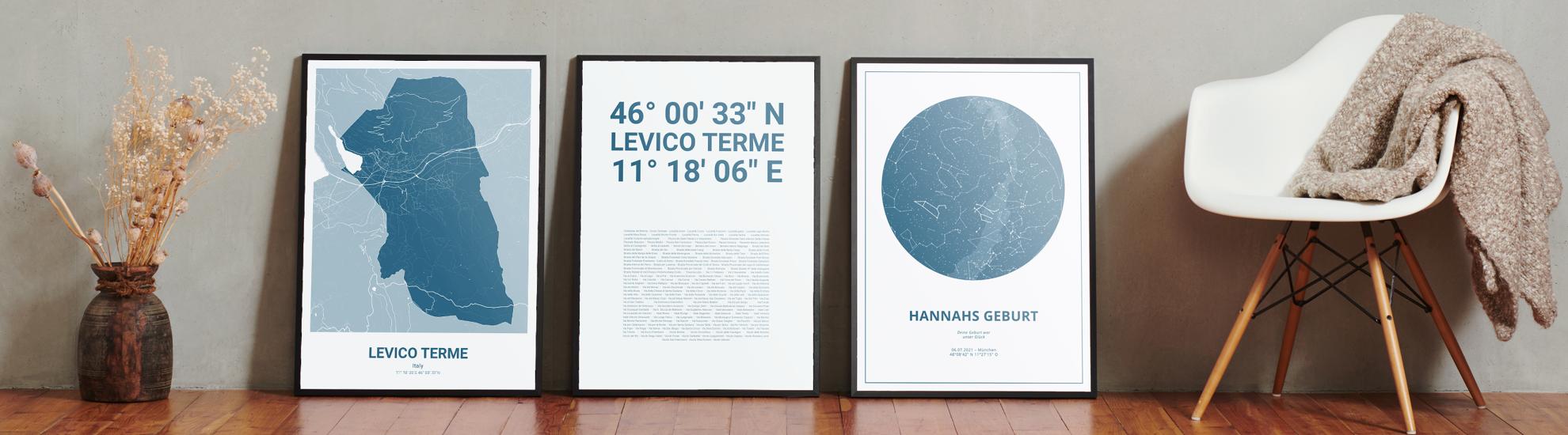 Wähle Farben und Layouts, die perfekt zu dir passen. Ob als klassische Karte in schwarz-weiß oder in modernen Farben. Bei Cartida kannst du ein Design in deinen Lieblingsfarben wählen. Erstelle eine Variante von Levico Terme, die perfekt zu dir und deiner Wohnung passt.