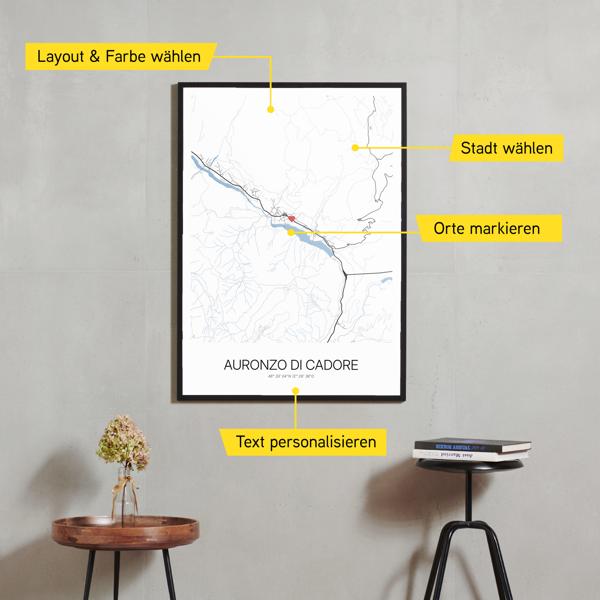 Wähle Farben und Layouts, die perfekt zu dir passen. Ob als klassische Karte in schwarz-weiß oder in modernen Farben. Bei Cartida kannst du ein Design in deinen Lieblingsfarben wählen. Erstelle eine Variante von Auronzo di Cadore, die perfekt zu dir und deiner Wohnung passt.