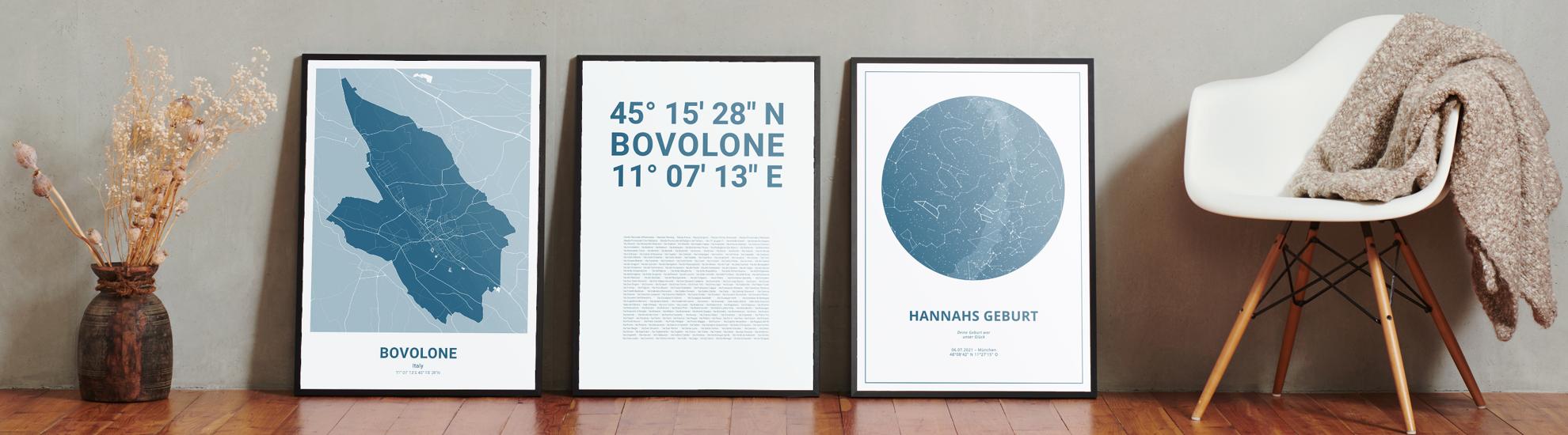 Wähle Farben und Layouts, die perfekt zu dir passen. Ob als klassische Karte in schwarz-weiß oder in modernen Farben. Bei Cartida kannst du ein Design in deinen Lieblingsfarben wählen. Erstelle eine Variante von Bovolone, die perfekt zu dir und deiner Wohnung passt.