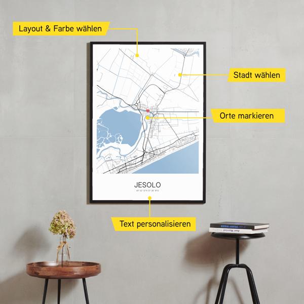Wähle Farben und Layouts, die perfekt zu dir passen. Ob als klassische Karte in schwarz-weiß oder in modernen Farben. Bei Cartida kannst du ein Design in deinen Lieblingsfarben wählen. Erstelle eine Variante von Jesolo, die perfekt zu dir und deiner Wohnung passt.