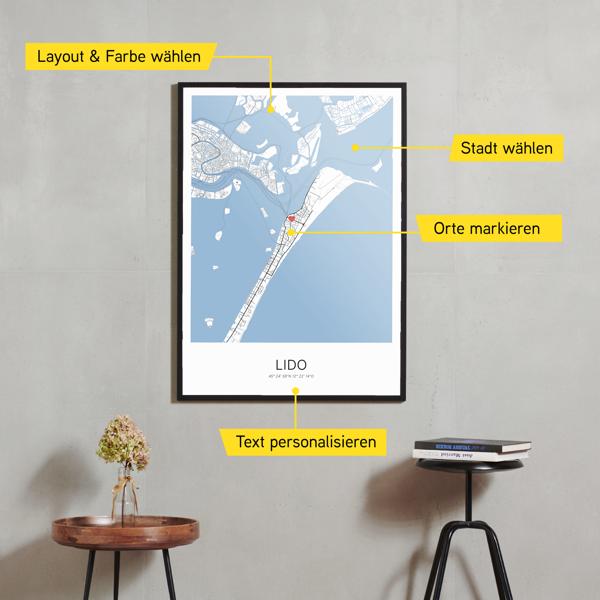 Wähle Farben und Layouts, die perfekt zu dir passen. Ob als klassische Karte in schwarz-weiß oder in modernen Farben. Bei Cartida kannst du ein Design in deinen Lieblingsfarben wählen. Erstelle eine Variante von Lido, die perfekt zu dir und deiner Wohnung passt.
