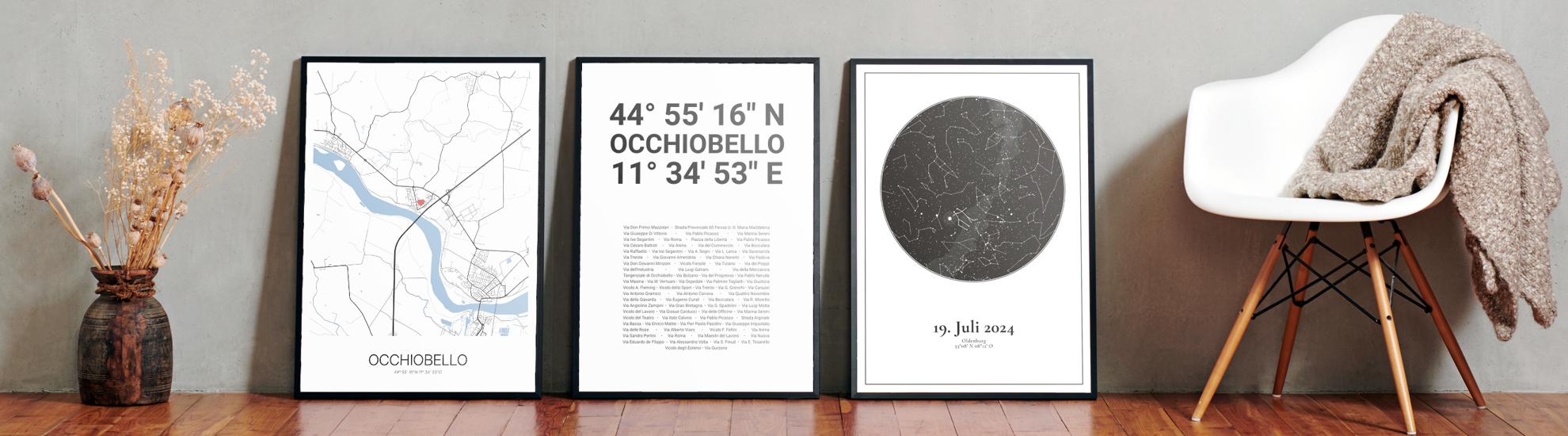 Bilder, die Geschichten erzählen über Reisen, Liebe und Erinnerungen. Wir bei Cartida haben deine Stadtkarte von Occhiobello in Veneto, Italien. Dargestellt als Schwarzplan mit Gebäuden oder als Minimal City Map mit filigranen Straßennetz.