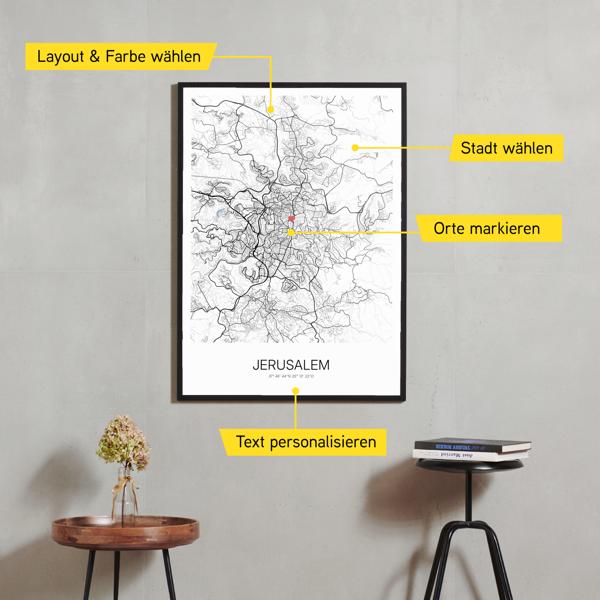Wähle Farben und Layouts, die perfekt zu dir passen. Ob als klassische Karte in schwarz-weiß oder in modernen Farben. Bei Cartida kannst du ein Design in deinen Lieblingsfarben wählen. Erstelle eine Variante von Jerusalem, die perfekt zu dir und deiner Wohnung passt.
