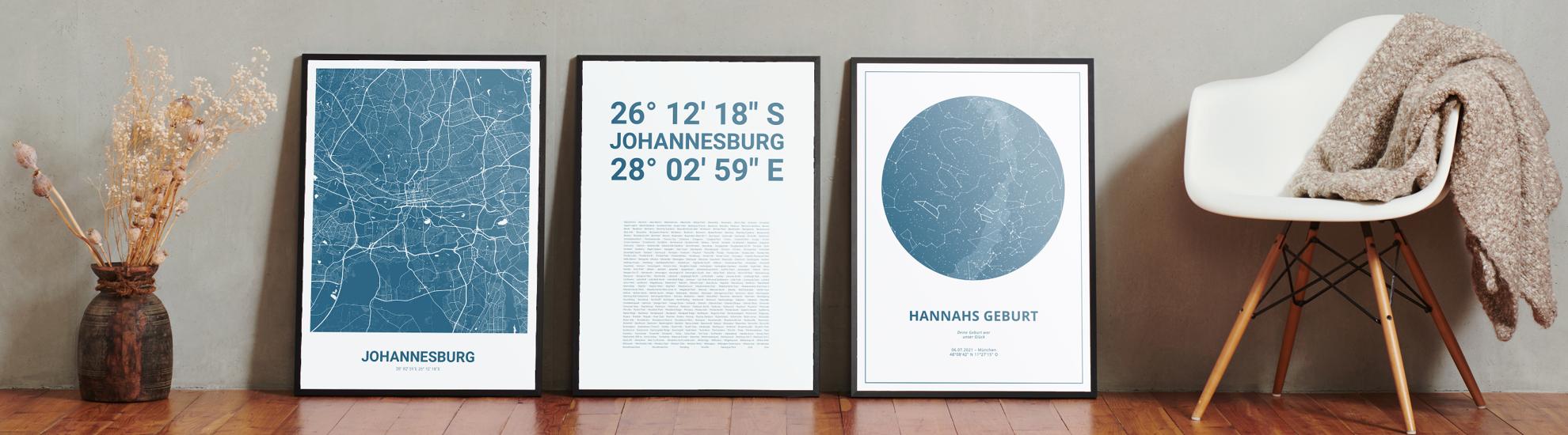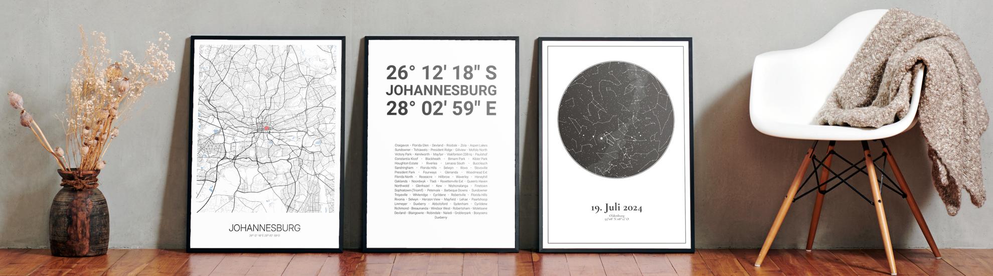 Wähle Farben und Layouts, die perfekt zu dir passen. Ob als klassische Karte in schwarz-weiß oder in modernen Farben. Bei Cartida kannst du ein Design in deinen Lieblingsfarben wählen. Erstelle eine Variante von Johannesburg, die perfekt zu dir und deiner Wohnung passt.