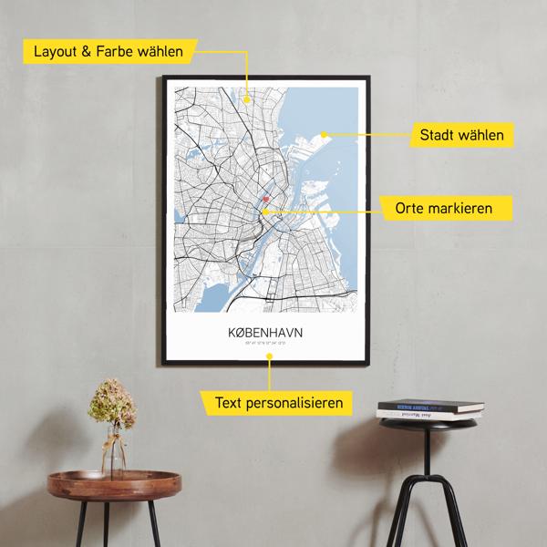 Wähle Farben und Layouts, die perfekt zu dir passen. Ob als klassische Karte in schwarz-weiß oder in modernen Farben. Bei Cartida kannst du ein Design in deinen Lieblingsfarben wählen. Erstelle eine Variante von København, die perfekt zu dir und deiner Wohnung passt.
