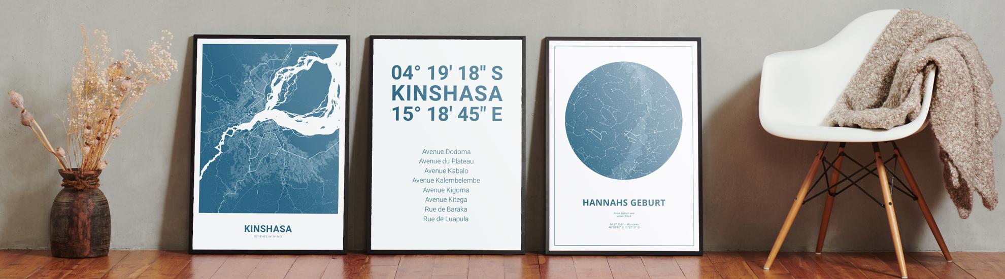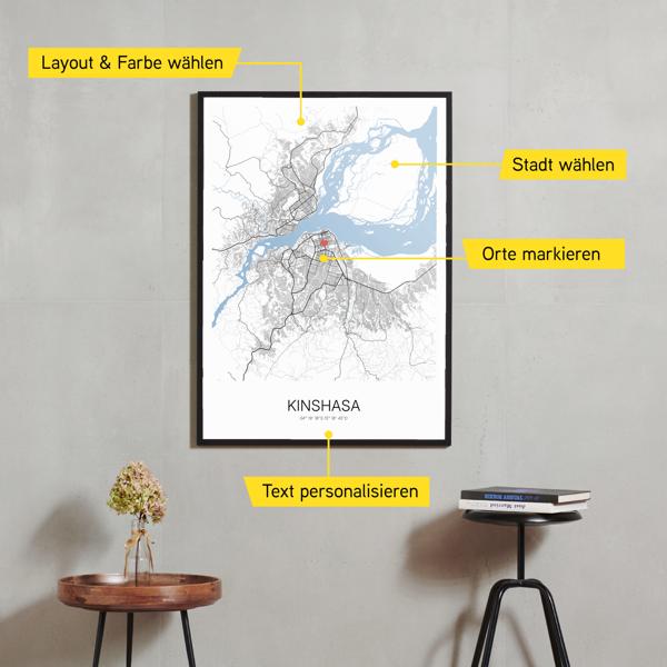 Wähle Farben und Layouts, die perfekt zu dir passen. Ob als klassische Karte in schwarz-weiß oder in modernen Farben. Bei Cartida kannst du ein Design in deinen Lieblingsfarben wählen. Erstelle eine Variante von Kinshasa, die perfekt zu dir und deiner Wohnung passt.