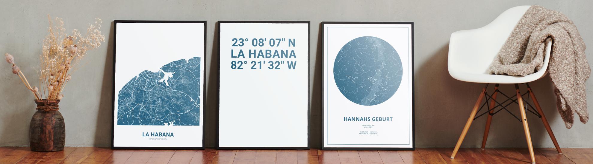 Zahlen, die die Welt bedeuten. Erstelle jetzt dein persönliches Koordinaten-Kunstwerk von deiner Lieblingsstadt. Entscheide selbst, ob Stadtteile, Straßen oder ganz eigene Texte abgedruckt werden. Perfekt als Geschenk zum Einzug oder für die eigenen vier Wände.
