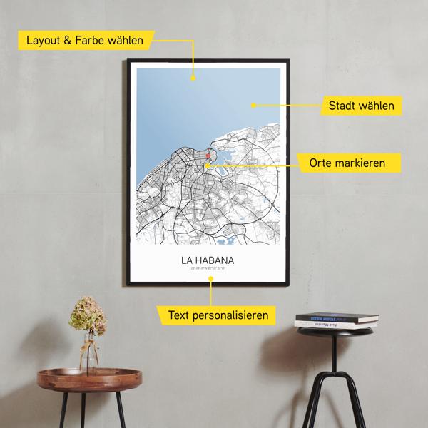 Wähle Farben und Layouts, die perfekt zu dir passen. Ob als klassische Karte in schwarz-weiß oder in modernen Farben. Bei Cartida kannst du ein Design in deinen Lieblingsfarben wählen. Erstelle eine Variante von La Habana, die perfekt zu dir und deiner Wohnung passt.