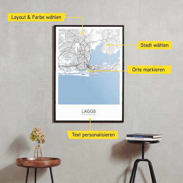 Wähle Farben und Layouts, die perfekt zu dir passen. Ob als klassische Karte in schwarz-weiß oder in modernen Farben. Bei Cartida kannst du ein Design in deinen Lieblingsfarben wählen. Erstelle eine Variante von Lagos, die perfekt zu dir und deiner Wohnung passt.