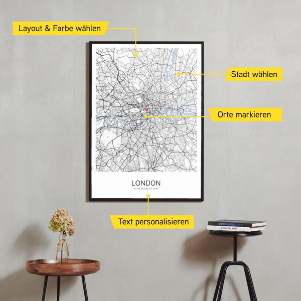 Wähle Farben und Layouts, die perfekt zu dir passen. Ob als klassische Karte in schwarz-weiß oder in modernen Farben. Bei Cartida kannst du ein Design in deinen Lieblingsfarben wählen. Erstelle eine Variante von London, die perfekt zu dir und deiner Wohnung passt.