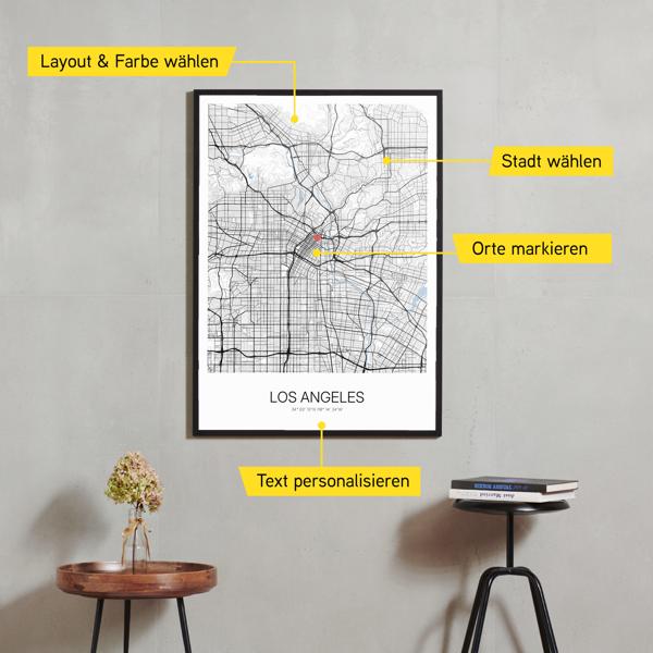 Wähle Farben und Layouts, die perfekt zu dir passen. Ob als klassische Karte in schwarz-weiß oder in modernen Farben. Bei Cartida kannst du ein Design in deinen Lieblingsfarben wählen. Erstelle eine Variante von Los Angeles, die perfekt zu dir und deiner Wohnung passt.
