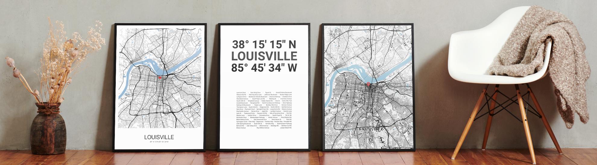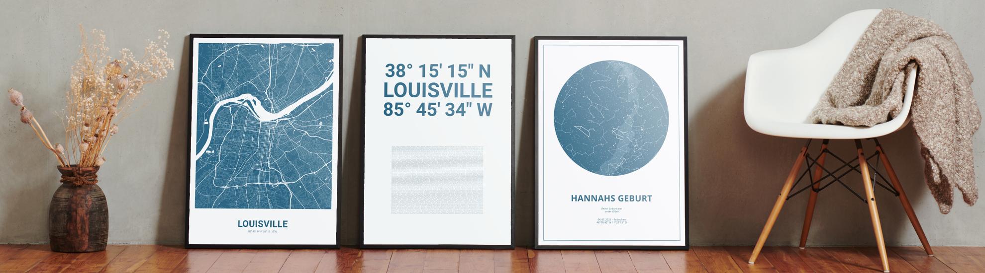 Wähle Farben und Layouts, die perfekt zu dir passen. Ob als klassische Karte in schwarz-weiß oder in modernen Farben. Bei Cartida kannst du ein Design in deinen Lieblingsfarben wählen. Erstelle eine Variante von Louisville, die perfekt zu dir und deiner Wohnung passt.