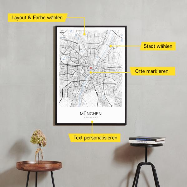 Wähle Farben und Layouts, die perfekt zu dir passen. Ob als klassische Karte in schwarz-weiß oder in modernen Farben. Bei Cartida kannst du ein Design in deinen Lieblingsfarben wählen. Erstelle eine Variante von München, die perfekt zu dir und deiner Wohnung passt.